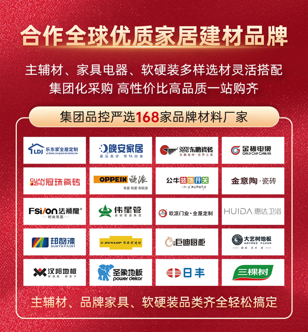 東家樂家裝聯(lián)合超百家國(guó)內(nèi)外知名品牌裝修材料廠家,組成裝修品牌聯(lián)盟,所有材料從工廠直接到工地,沒有中間商賺差價(jià)。廠家直供節(jié)省百分之30費(fèi)用,嚴(yán)選國(guó)內(nèi)外一線主材品牌裝修材料工廠集中采購(gòu),環(huán)保指數(shù)超國(guó)家標(biāo)準(zhǔn),讓家庭裝修更健康,鑄就品質(zhì)家裝。
