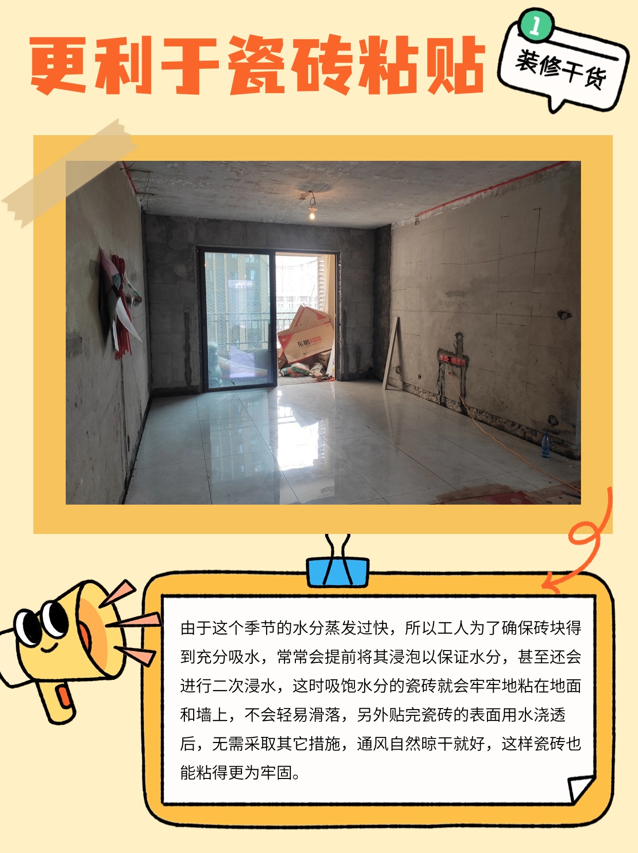 由于這個季節(jié)的水分蒸發(fā)過快,所以工人為了確保磚塊得到充分吸水,常常會提前將其浸泡以保證水分,甚至還會進行二次浸水,這時吸飽水分的瓷磚就會牢牢地粘在地面和墻上,不會輕易滑落,另外貼完瓷磚的表面用水澆透后,無需采取其它措施,通風自然晾干就好,這樣瓷磚也能粘得更為牢固。