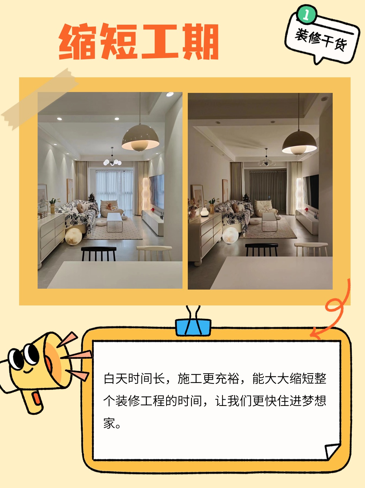 白天時間長,施工更充裕,能大大縮短整個裝修工程的時間,讓我們更快住進夢想家。