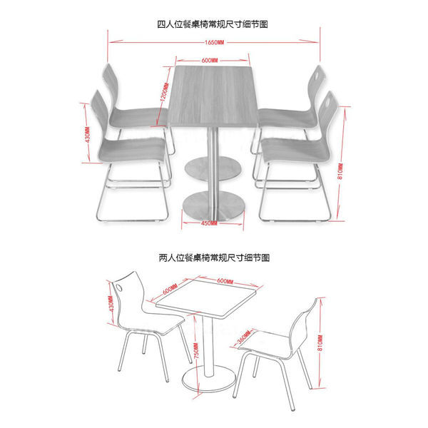 760mm x 760mm的方桌和1070mm x 760mm的長方形桌是常用的餐桌尺寸。如果椅子可伸入桌底,即便是很小的角落,也可以放一張六座位的餐桌,用餐時,只把需餐桌拉出一些就可以了。760mm的餐桌寬度是標準尺寸,至少也不宜小于700mm,否則,對坐時會因餐桌太窄而互相碰腳。餐桌的腳最好是縮在中間,如果四只腳安排在四角,就很不方便。桌高一般為710mm,配415mm高度的坐椅。桌面低些,就餐時,可對餐桌上的食品看得清楚些。
