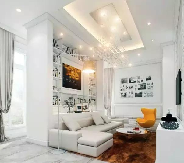 不放電視,那么客廳在設計時就要多考慮裝飾元素,把電視機處換成其他元素代替,如: