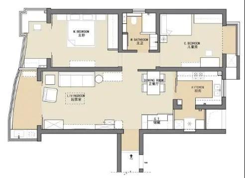 拆除原有書房,陽臺(tái)納入室內(nèi),打造一個(gè)寬敞通透的大客廳,原有客廳變成餐廳,加入儲(chǔ)物柜設(shè)計(jì),提升整體收納保持空間整潔。利用廚房1㎡的北陽臺(tái),打造成廚房電器區(qū)。