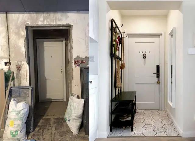 入戶借用1m公共空間,做成獨(dú)立小玄關(guān)。地面鋪貼六邊形花磚,防滑耐臟而且顏值也不差。成品鞋帽架搭配穿衣鏡,讓小小的玄關(guān)空間提升實(shí)用性。將餐廳多余空間改成儲(chǔ)物間,1.98*0.95規(guī)格,收納能力還是不錯(cuò)的。借用儲(chǔ)物間一面設(shè)計(jì)鞋柜,滿足玄關(guān)對(duì)鞋的收納。