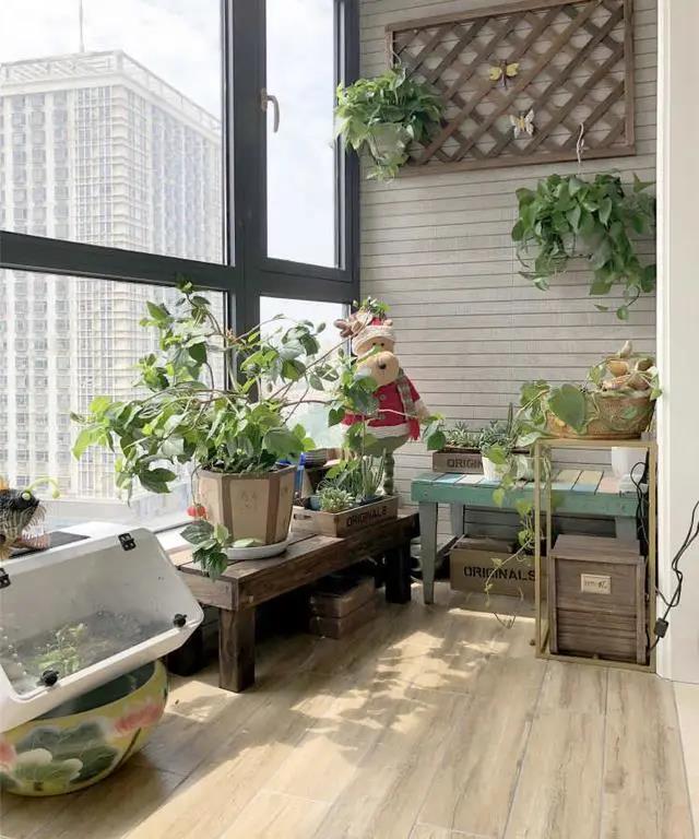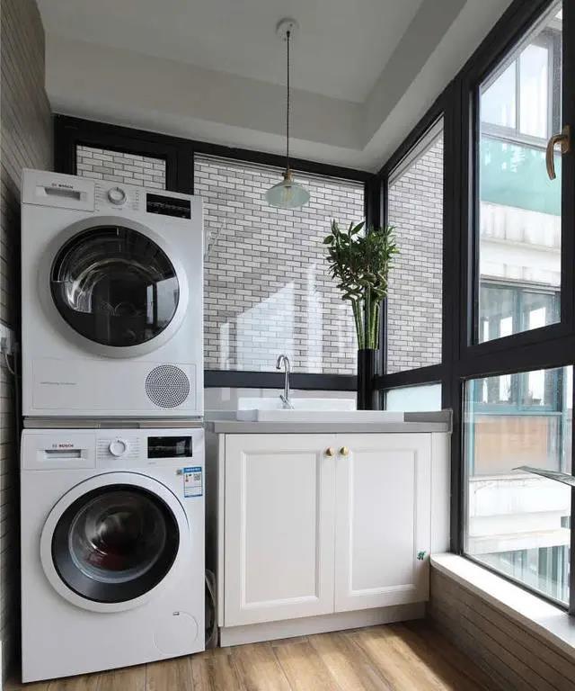 陽臺(tái)布局實(shí)用有情調(diào),一側(cè)布置成洗衣區(qū),洗衣機(jī)、干衣機(jī)、洗衣柜搭配小吊燈。另一側(cè),復(fù)古風(fēng)的家具和花花草草,完全陶冶生活的小天地。